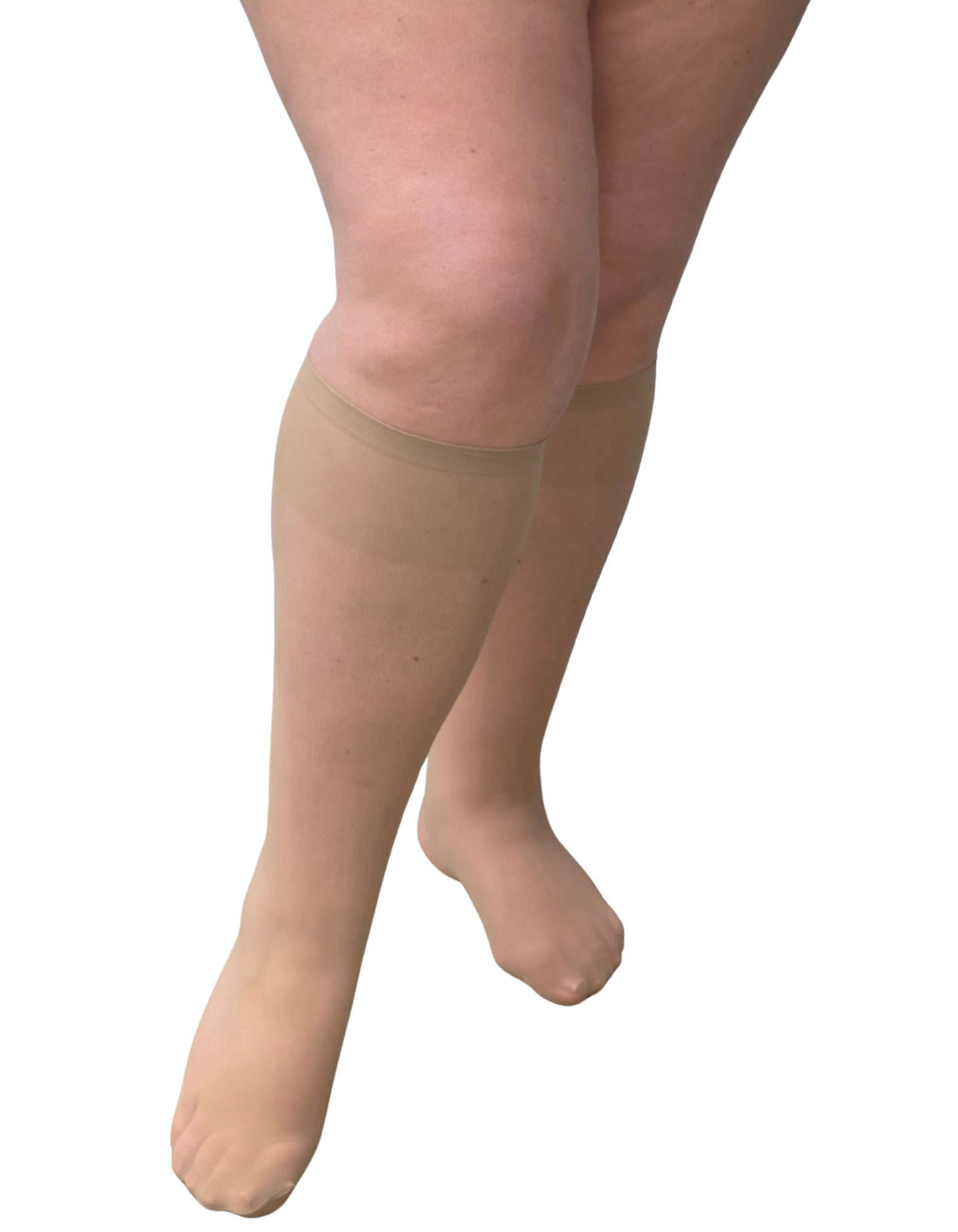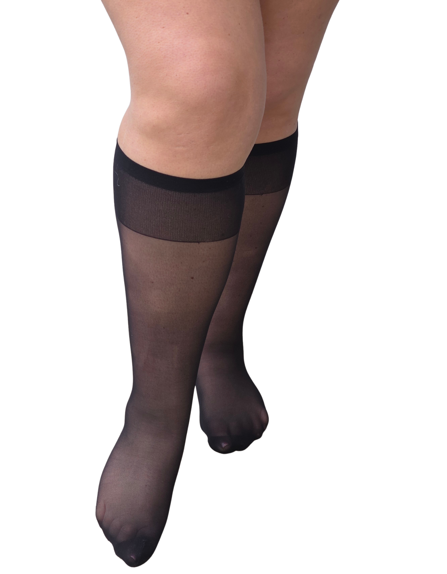 Brand new addition to the super wide knee high sock range; 15 denier, these super wide knee high socks are made especially for plus size legs. The sheer 15 denier yarn has been knitted with 3D technology making them super stretchy without sagging. There is no digging with these socks as the welts have been formulated for a wider comfort fit. Available in one size which stretches to fit up to 85cm around the calf. The socks are made without heels so they can fit any shoe size comfortably.