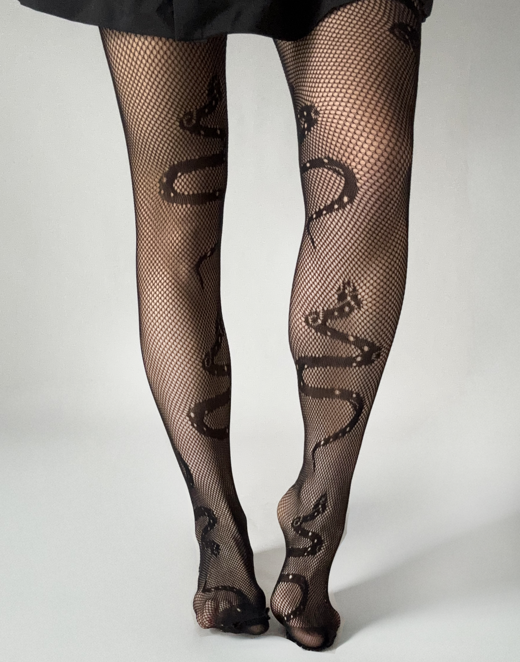 Add an edge to your look with these striking black net tights, featuring delicate snakes subtly woven around the legs.